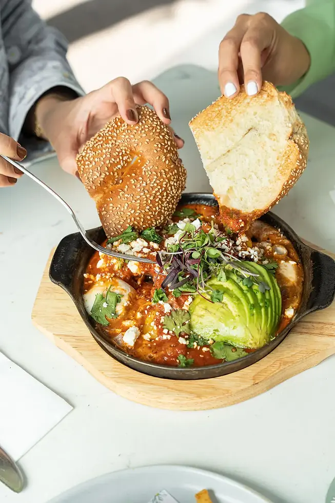 Bae's Shakshuka: Spice things up with this Middle Eastern favorite! Eggs are poached in a flavorful tomato sauce with feta cheese and served with a side of Jerusalem bagel for dipping. Très délicieux! It’s a hearty and healthy dish packed with protein and flavor, making it a must-try for your next brunch at Café Bastille.